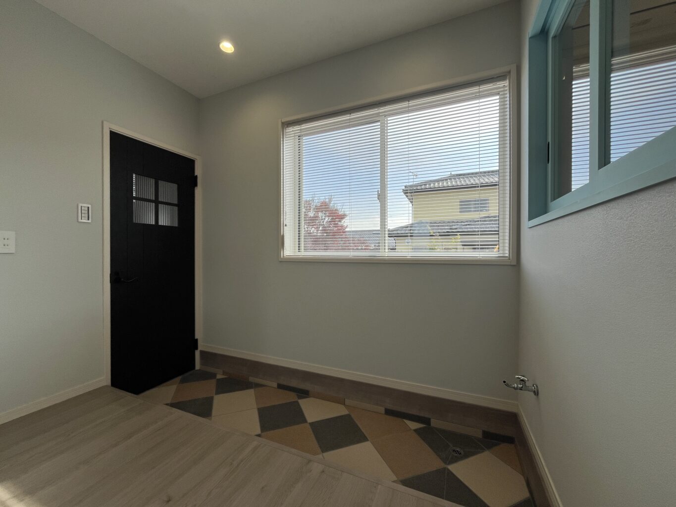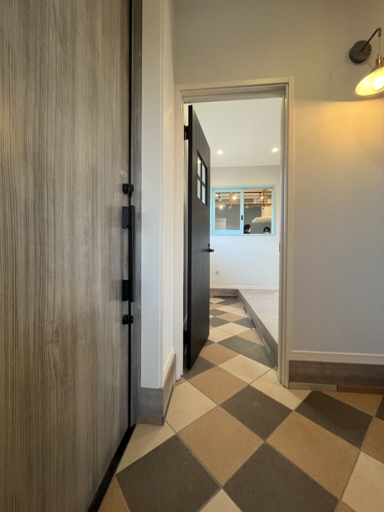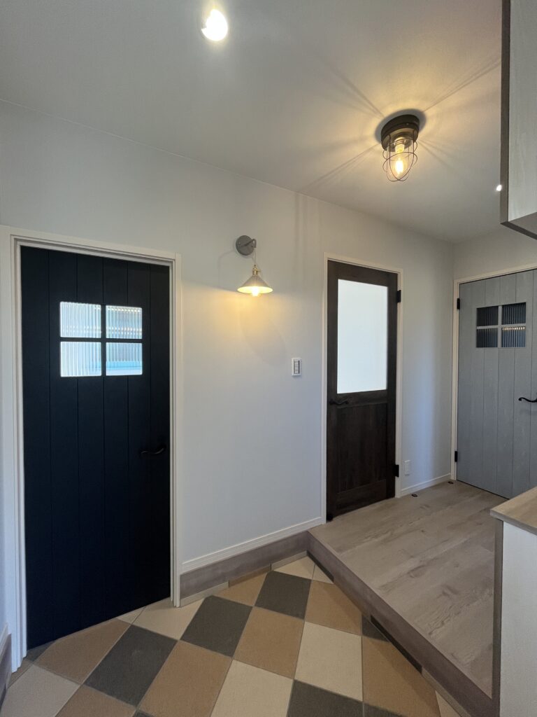 かわいらしいタイルが外でも中でもお出迎え。玄関に入ると、わんちゃんたちの手足もすぐ洗える水道付きの土間がとても工夫されている動線になっています。
