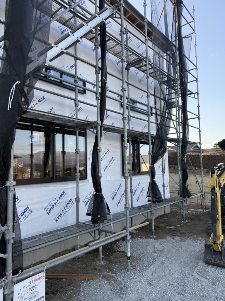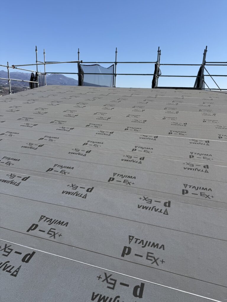 吉岡町の新築現場からです。屋根のルーフィング施工やサッシの取り付けが完了しました。
