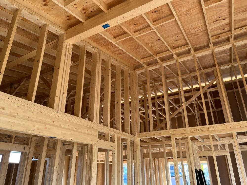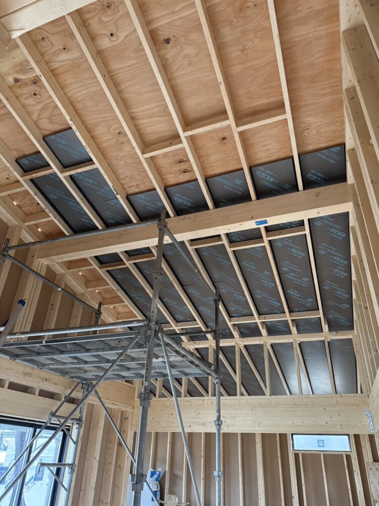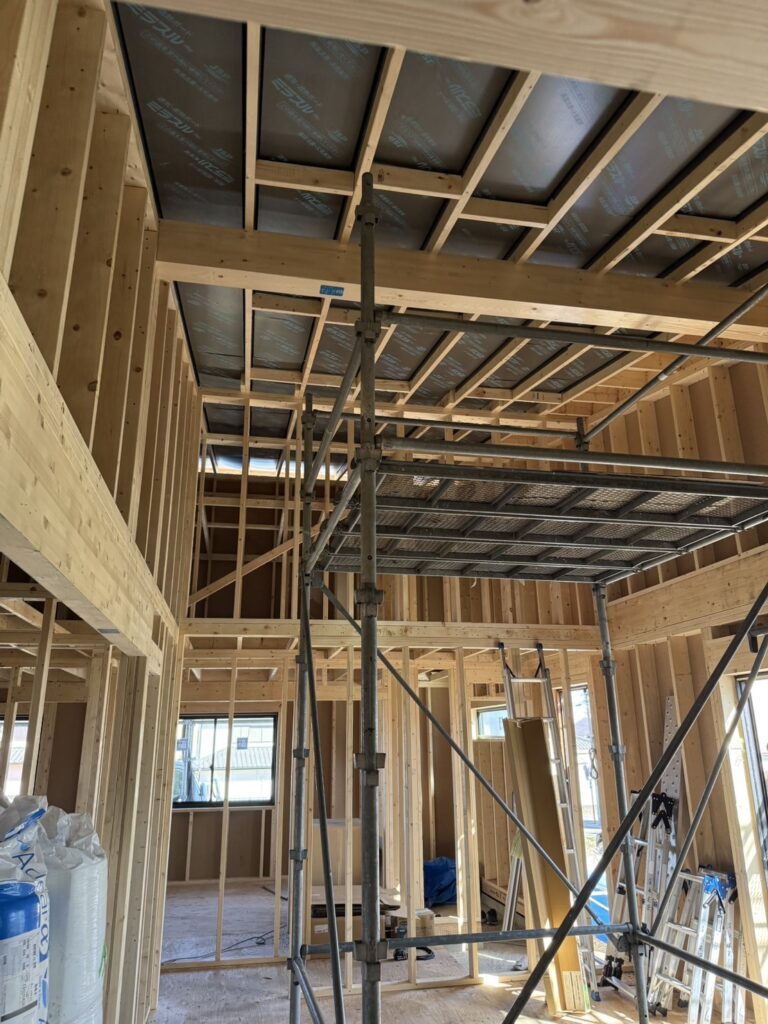 内装では、とっても広いリビングに屋内足場を設置させていただき、天井遮ボード施工が開始されました。